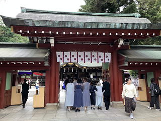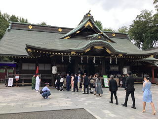 摂社・宮乃咩神社や相撲場、手水舎を左右に見て進み、随神門と中雀門をくぐるとちょうど、結婚式の御一行が神職に導かれて拝殿に入るところ。おめでとうございます。