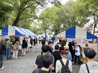 イベントは定刻通りにスタートしました。主催は東京都酒造組合ですが、広場を囲むように設営されたテントにはたくさんの酒造会社から自慢の酒が出品されており、その数は岩手・福岡・長崎・沖縄以外の43都県から142種類となっています。参加者は入口でチケットのチェックを受けたら出品酒リストと共にお猪口とPETボトルの水をもらい、会場内を自由に歩いて気に入ったお酒を時間の許す限りいくらでも試飲できる仕組みです。
