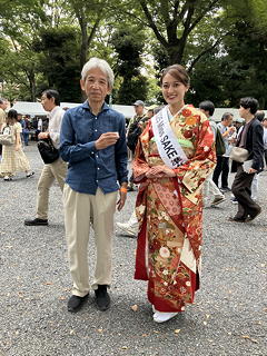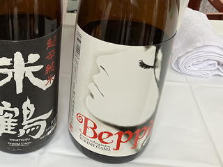 ラベルが凝っているお酒もあって、なんとも言えずセクシーなラベルは香川県川鶴酒造の「艶鶴」と山形県鯉川酒造の「Beppin 雪女神」です。そしてこれらをいただいてから、会場内でリアルべっぴんな笑顔を振りまいていたMiss SAKE準グランプリの弭間花菜さんに一緒に写真に収まっていただきました。ありがとうございます。
