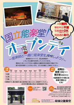 そんな自分にうってつけの企画として目をつけたのが、国立能楽堂が実施している「オープンデイ」です。これは能楽師の方が国立能楽堂の中を案内しながら諸々解説してくださるというもので、予約不要・料金不要・所要1時間ほどという実にコンビニエントな催し。ありがたいことです。