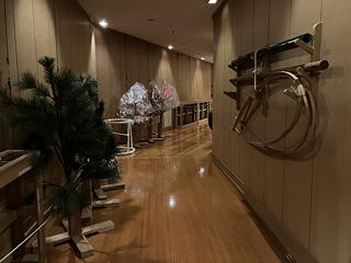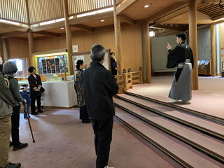 この日3回開催される「オープンデイ」の2回目にあたる16時半に国立能楽堂の正面玄関に着くと、すぐにロビーに通されて案内役の能楽師の方々との対面となったのですが、平日の日中だしこの天気だから参加者は少ないだろうと思っていたらなんとこの回だけで50名以上の参加があり、これを三つのグループに分けて案内されることになりました。私が属したグループを引率してくださったのは和泉流(野村万蔵家)狂言師の河野佑紀師でしたが、これでも参加者は少ない方で、あるときは1グループだけで50人も案内したことがあるのだそうです。
