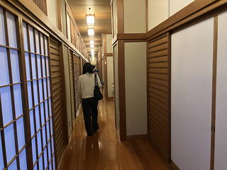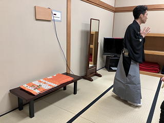 続いていよいよ、これまで見る機会のなかった楽屋を拝見します。普段我々観客が通ることのない通路を通り、靴を脱いで廊下を進むとそこには畳敷きの部屋が連なっていて、シテ方・ワキ方・狂言師・囃子方がそれぞれの部屋を使う作りになっているようです。