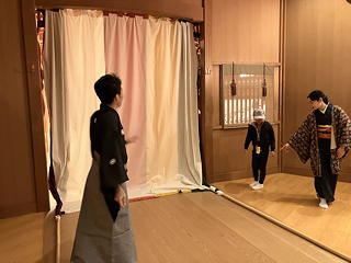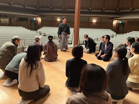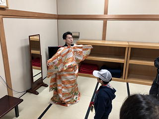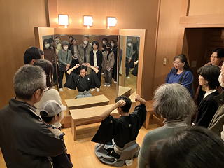 さらに楽屋の中で座る位置について「人間国宝級の先生はここ、自分たち(若手)はこのへん」といった上下関係の存在と、能楽師同士がすれ違うときに瞬時に正座して「こんにちは」とやる挨拶の仕方を学んでから、質疑応答が行われました。私からの質問は「開演時刻の何時間前に楽屋入りするのか」というもので、これに対する河野師の答は「1時間前」と意外に短いものでした。さらにもう一人から、女性の能楽師もこの楽屋で着替えるのかという質問が出ましたが、これはナイスクエスチョン。狂言師は目下のところほぼ男性社会なのでそうした事態に遭遇していないのですが、シテ方と囃子方ではすでに女性プロが活躍しているし、今後その人口はますます増えるはずなので、そうなるといずれ能楽堂の作り自体にも影響してくるのかもしれません。