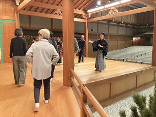 さて、せっかく狂言師が引率して下さっているので、笑い方・怒り方(男女)のお手本を示していただいて参加者も後に続きました。これによって、客席に向かって声を通すことの面白さと難しさを実感できたことも貴重でしたし、足拍子を踏むと舞台がちゃんと鳴ってくれることにも感銘を受けました。