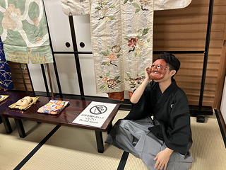 舞台から楽屋へ戻る途中、ふと横を見ると作リ物が置かれた暗い廊下がありました。この摩訶不思議なカーブは橋掛リの形に沿ったものに違いなく、実に興味深いものです。そして楽屋に戻り、そこに用意されていた狂言面(武悪・乙・小猿)や狂言装束の説明がありましたが、河野師が武悪面を掛けて「取って噛もう!」と声を出すと参加していたちびっ子から即座に「『清水』だ」という声が上がったのにはびっくり。もしかして狂言を習っているのかな?
