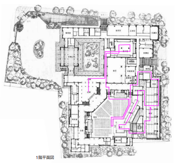 今回案内していただいた動線(ロビーを出発して楽屋に戻るまで)を平面図上に描くと、おそらくこんな感じだっただろうと思います。