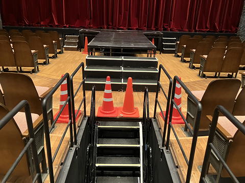- 舞台面を下げ、客席の角度を変えることができる機構。そうしたシステムを持っている舞台は日本に二つしかない。