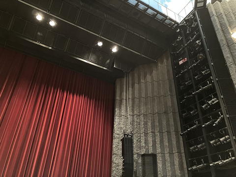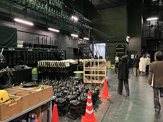 さらに音響さんの説明に移り、先ほどの「ツァラトゥストラ」が左右の壁面の網の中とプロセニアム・アーチの上に隠れているスピーカーの3点から流されていたことが紹介されると共に、天井(シーリング)から音を出した場合と3フロアそれぞれの壁面(ウォール)から音を出した場合との違いを体感させてくれました。この音像作りは白井氏にとってもこだわりポイントらしく、客席後方の扉を開けてその外から爆発音を響かせるという演出を行ったこともあるそうです。