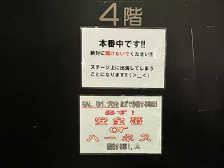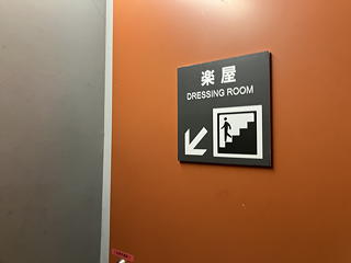 さて、役者が舞台に向かう前の最終チェックポイント(そこにも鏡あり)を通って舞台の下手側の袖へ向かいます。そのとき「下手」の表示の脇に英語で「Stage Right」と書いてあってなるほどと思ったのですが、日本語では舞台を「観る」者の立場から右左=上下を定義する(これは芸能が神への奉納であったことに由来する模様)のに対し、英語では舞台に「立つ」者の立場から右左を見るようです。
