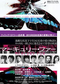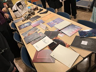 楽屋受付前のテーブルには、白井氏が演出した過去の作品の資料たち。2022年の「マーキュリー・ファー」で吉沢亮[1]が使ったというガスマスクやピストルも置いてありましたが、本来ここは、役者さんが朝着いてお茶を飲んだりマチネとソワレの間にお弁当を食べたりのあれやこれやをする場所だそうです。