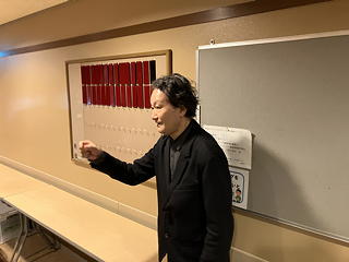 その近くにある赤黒の名札は着到板と呼ばれ、俳優やスタッフが到着したら黒、帰るときは赤を表にする仕組み。これは日本独自の風習らしく、海外からの俳優はこれを面白がって写真に撮っていったりするのだとか。なお、開演の1時間半前には「着到」するのが標準という話でしたが、着到が遅れた場合、ブロードウェイなどでは40分前に来ていなければ問答無用でセカンドに代えられるのだそう。これには参加者から「えー!」という声が上がりましたが、日本でもコロナ禍のときから、どんな役でも代演できるスウィングと呼ばれる役者を男女1名ずつ用意するバックアップシステムを導入するようになり、実際に「マーキュリー・ファー」で北村匠海が熱を出した日に急遽代役を立てたことがあるということでした。
