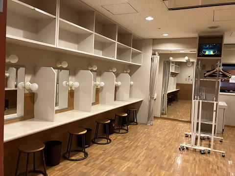 受付横の通路を進むと、部屋の中にはずらりと鏡台(化粧前)が並びます。鏡を三方から囲む電球は舞台上の照明と同様の灯りの中でメイクできるようにするための工夫で、当劇場にはこうした部屋が四つあり、公立劇場なので主役用の個室というのは設けられていないものの、どれか一つを主役が個室的に使うことはあるそうです。