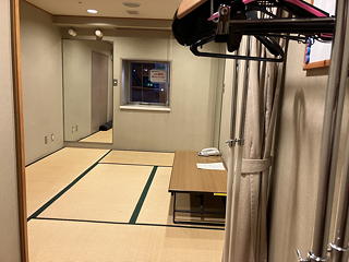 白井氏の前に20年間芸術監督を勤めた野村萬斎師がよく使っていたという和室もありました。やはり萬斎師はこちらの方が落ち着くのでしょう。さらにランドリーがあって、芝居が終わったらすぐに脱いでもらって洗濯→乾燥。よって公演期間中の当劇場では衣装部の人たちが一番最後に帰ることになります。なお、マチソワの間でも洗濯はするのですが、どうしても間に合わない(乾きにくい)衣装のときは2着作ることもあるそうです。何にしてもたいへんなことです。