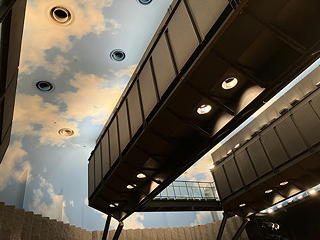 そういえば、この劇場内で緞帳が降りている状態を見るのはこれが初めてかも。そしてこの劇場は、見れば見るほど天井の高さが特徴的です。しかも見上げた先には柔らかい雲を浮かべた青空の絵が描かれていて、何か神聖なものがこの空間を穏やかに見守っているような雰囲気を漂わせています。