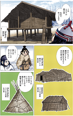 この漫画の中でヒロインのアシㇼパは、秘密に守られている金塊の所在地を示す暗号を解く鍵を求めて北海道各地を旅した後にサハリンに渡り、北緯50度線を越えてロシア領に入るのですが、その旅の過程で同行しているキロランケ(樺太アイヌの曾祖母を持つタタール人)がサハリン少数民族の文化について事細かに解説していきます。そして、北海道アイヌであるアシㇼパがこの旅を通じてサハリンアイヌ、ニヴフ、ウイルタの文化に触れわたしたちはちょっと違ってちょっと似ている